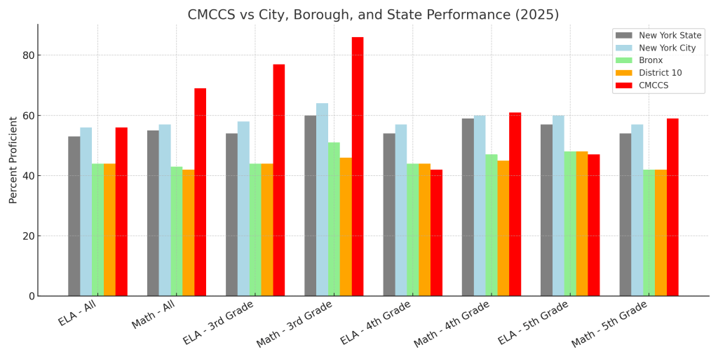 Cardinal McCloskey Community Charter School’s (CMCCS) strong academic performance is illustrated in the graph above in RED, highlighting how the school exceeds the proficiency averages of New York State, New York City, the Bronx, and District 10. Across nearly all tested grades and subjects, CMCCS consistently exceeds local district and borough proficiency rates—most notably achieving 77% proficiency in 3rd grade ELA and 86% in 3rd grade Math, far surpassing the Bronx and District 10 averages. These results demonstrate CMCCS’s commitment to academic excellence and its success in providing students with the skills and support needed to thrive.