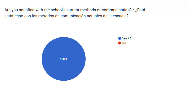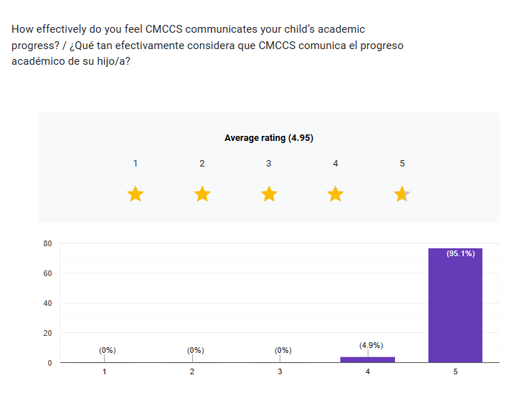 The survey results below indicate that families are fully satisfied with the school’s current communication methods, with all respondents selecting “Yes.” Parents also rated CMCCS’s communication of their child’s academic progress extremely positively, giving an average score of 4.95 out of 5, with the vast majority selecting the highest rating.
